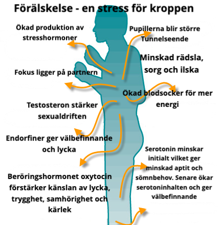 Förälskelsen ger ett kraftigt stresspåslag som gör att vi lägger allt fokus på partnern. Detta tar mycket energi och kan inte fortgå för länge (tyvärr ;). Förälskelsen behövs för att vi ska kunna knyta an till en annan människa. Ungefär efter 6 månader övergår förälskelsen till en etablerad relation. Ni har blivit varandras trygga punkt i livet. Upprymdheten för varandra ersätts av ett lugn när ni är tillsammans. Ett älskande par kommer variera sin nivå av förälskelse i vågor under förhållandets gång.